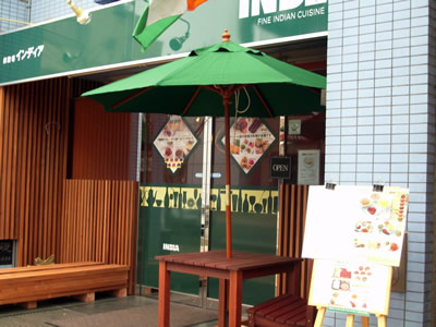 緑のパラソルとインドの旗が目印です。
